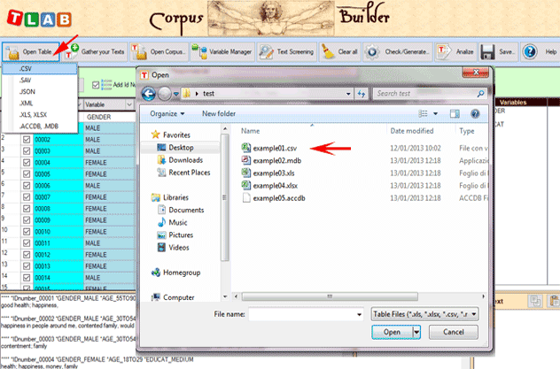 un fichier individuel à travers l'option "Open Corpus" ou bien de