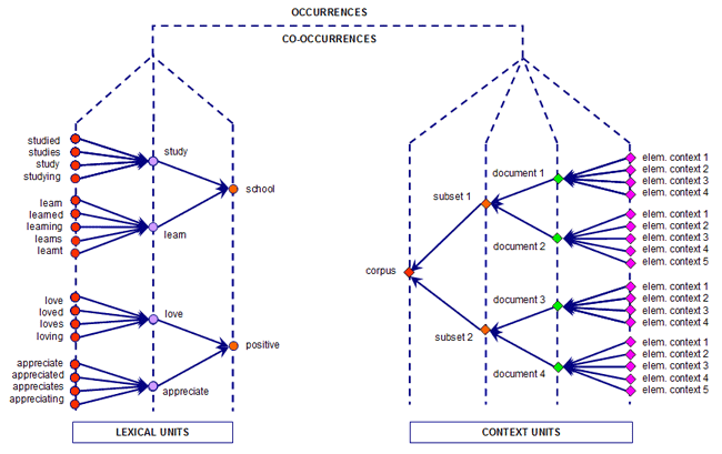 Per capire come T-LAB funziona e come può essere usato, è di fondamentale importanza aver chiaro quali unità di analisi sono archiviate nel suo database e quali algoritmi statistici vengono usati nelle varie analisi. Infatti, le tabelle dati analizzate sono sempre costituite da righe e colonne le cui intestazioni corrispondono alle unità di analisi archiviate nel database, mentre gli algoritmi regolano i processi che consentono di individuare relazioni significative tra i dati e di estrarre utili informazioni. Le unità di analisi di T-LAB sono di due tipi: unità lessicali e unità di contesto. A - le UNITA' LESSICALI sono parole, singole o multiple, archiviate e classificate in base a un qualche criterio. Più precisamente, nel database T-LAB ogni unità lessicale costituisce un record classificato con due campi: forma e lemma. Nel primo campo, denominato forma, sono elencate le parole così come compaiono nel corpus, mentre nel secondo, denominato lemma, sono elencate le label attribuite a gruppi di unità lessicali classificate secondo criteri linguistici (es. lemmatizzazione) o tramite dizionari e griglie semantiche definite dall'utilizzatore. B - le UNITA' DI CONTESTO sono porzioni di testo in cui può essere suddiviso il corpus. Più esattamente, nella logica T-LAB, le unità di contesto possono essere di tre tipi: B.1 documenti primari,