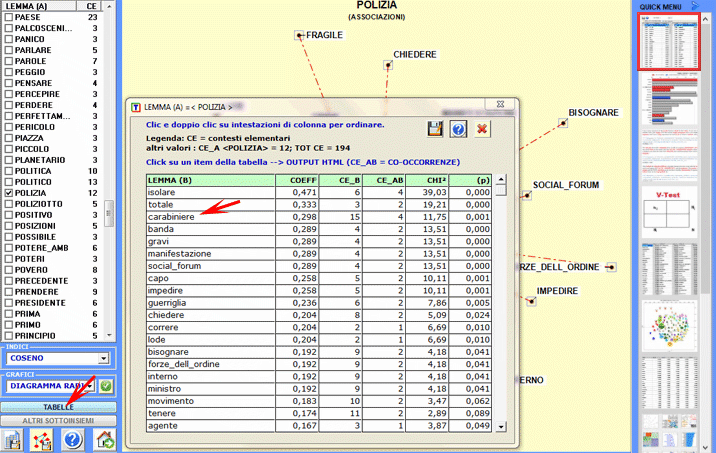 Ecco alcuni esempi di output (N.B.: per ulteriori informazioni sulla interpretazione degli output si rimanda alle corrispondenti sezioni della guida / manuale): Questo strumento T-LAB ci consente di verificare come i contesti di co-occorrenza determinano il significato locale delle parole chiave.