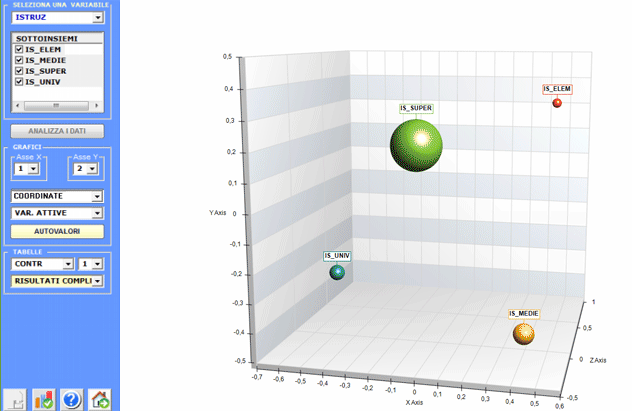 grafici disponibili mostrano le relazioni tra variabili attive, tra variabili illustrative, tra lemmi, tra lemmi e
